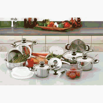 22pc 12-Element Super Set with Surgical Stainless Steel. The covers have a unique thermometer to help regulate cooking temperature. That means when you are trying to juggle a dozen kitchen chores while cooking, a simple glance at the thermometer tells you immediately if everything is fine. Better yet, you can stack cook with this cookware. That means you can start cooking on one burner and then stack the pan on top of another pan when it reaches cooking temperature, freeing up a burner. Limited lifetime warranty. Gift boxed.