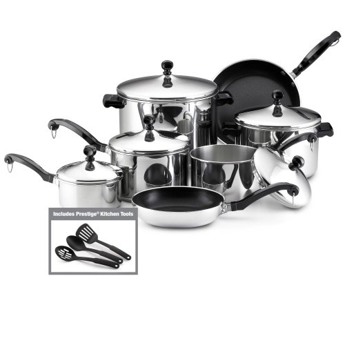If you have a large family or lots of dinner parties, this is for you. The "full cap" base has an aluminum core for even heating, and the stainless steel body offers lasting beauty. The handles are a traditional style that works in the most modern kitchens. This huge set is the most economical way to equip your kitchen.Includes: 1-quart, 2-quart. and 3-quart covered saucepans, 4-quart covered saucepot, 8-quart covered stockpot, 8-inch and 10-inch nonstick aluminum skillets, 3 Piece Prestige Kitchen Tools (Slotted Spoon, Slotted Turner, Solid Spoon. NOTE: 8-inch and 10-inch Skillets are not suitable for ceramic stove tops.