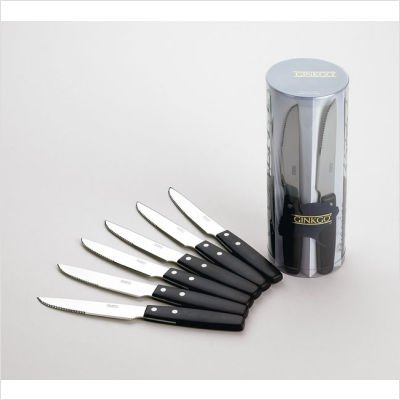 Ginkgo 079914144063 Enjoy the luxury of steakhouse knives in your own home! Ginkgo's Trattoria steak knives will help you savour that perfect cut of meat. The handle material is constructed of faux wood plastic so you will get the authentic look of wooden handled steak knives without the splinters and discomfort! Features: -Set of 6 steak knives -Handle material:faux wood plastic -Blades are made from 13/0 stainless steel -Dishwasher safe
