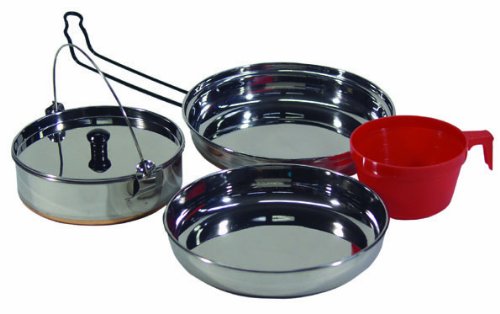 Ridgeline Cookset Solo, Solo Mess Kit: The classic 5-piece individual set for hikers, campers & cyclists The premium quality Stainless Steel cooksets are made from very sturdy 18/8 polished stainless steel, making them lightweight and extremely durable for any camping trip. All cooksets nest into a compact package. Dishwasher-safe. Ridgeline cooksets feature copper-reinforced bottoms for optimal heat transfer. Each set includes a carry bag for clean storage. Contents: - 0.5 qt. (0.5 L) pot with lid - 7" (18 cm) frying pan with folding handle - 6.5"(16 cm) stainless steel plate - Plastic cup - Nylon stuff sack, Mfg No: 41010, Manufacturer: Chinook