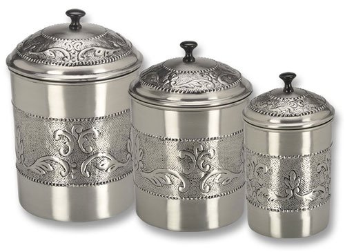 Victorian style meets modern convenience with these Antiqued Embossed Pewter Canisters. These kitchen containers are a great way to store flours, grains, pastas and more! You could even use one as a cookie jar. These iron canisters feature pewter plating, and the plating has handcrafted embossed details. These canisters are food safe, but not microwave safe. This set of three canisters includes a 5.5 quart jar, a 4 quart jar and 3 quart jar. Each has an airtight seal. Assembly level/degree of difficulty: No Assembly Required.